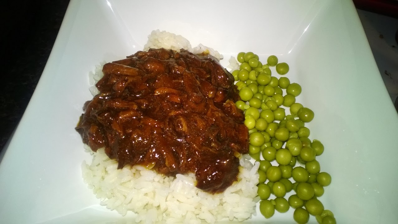 | Served over rice with a side of peas. |